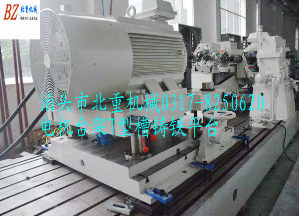 電機臺架T型槽鑄鐵平臺,T型槽鑄鐵平板工作面都加工有T型槽,中間距為200mm,一般用28t型螺絲,精度為2級。這樣的設(shè)計就是為了把電機定位在鑄鐵平臺上面,轉(zhuǎn)起來試驗,要得到數(shù)據(jù)等!